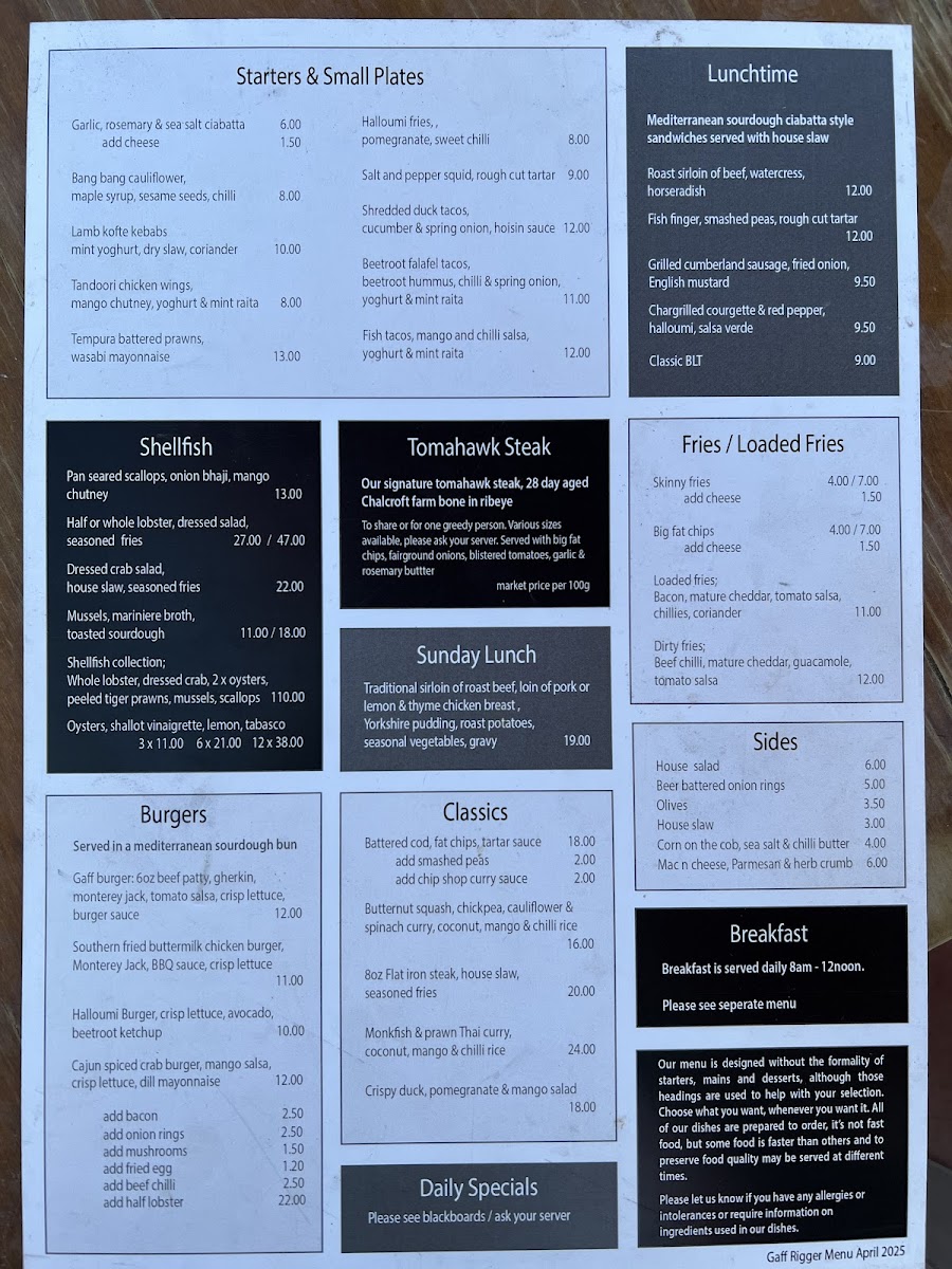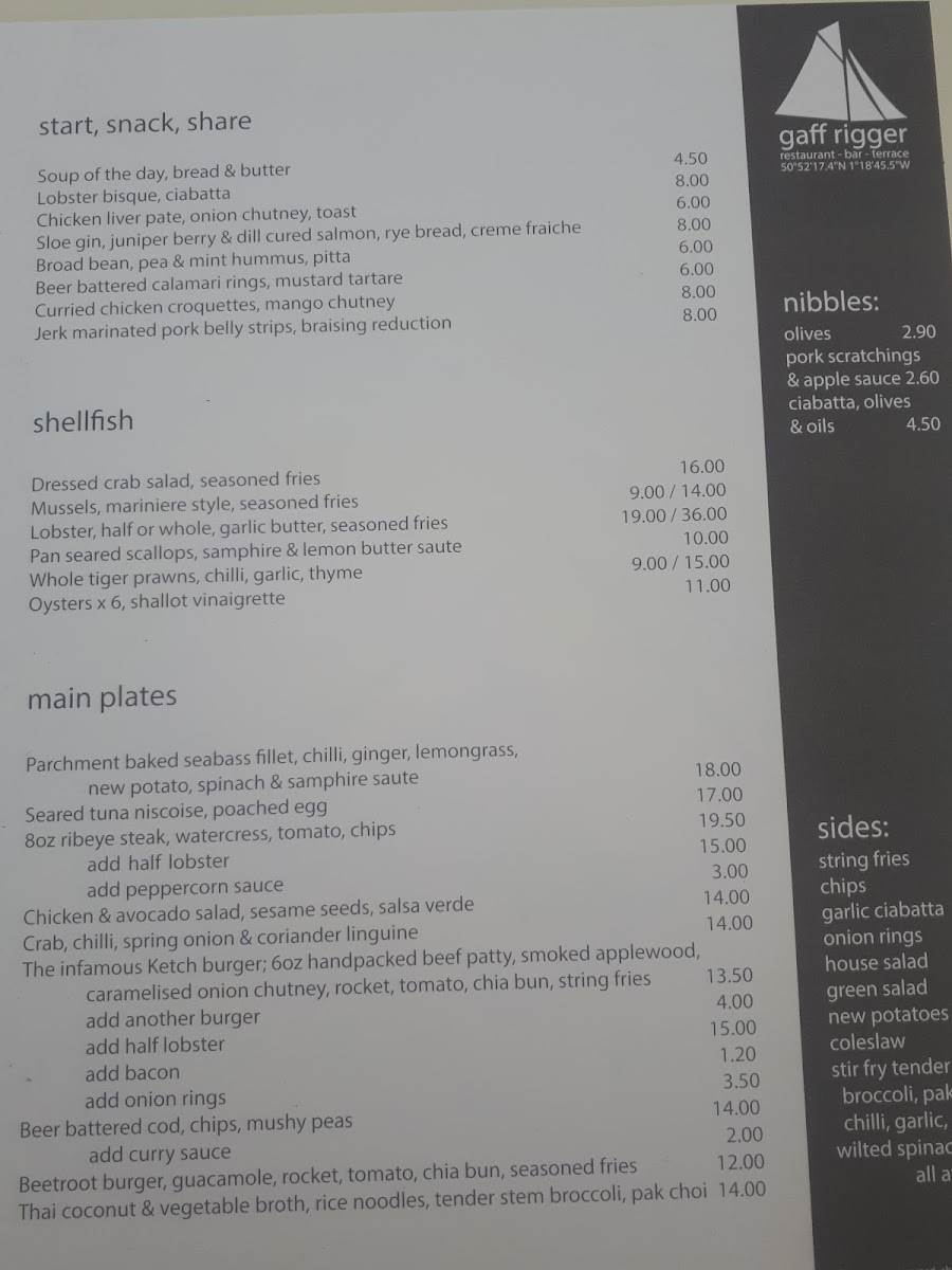 The menu at Gaff Rigger offers a delightful variety of dishes that cater to various tastes and preferences. Starting with light bites, the Soup of the Day is served with Bread & Butter, while the Lobster Bisque comes with Ciabatta. For a more indulgent start, there's the Chicken Liver Pate with Onion Chutney and Toast, or the refreshing Sloe Gin, Juniper Berry & Dill Cured Salmon with Rye Bread and Creme Fraiche. Shellfish lovers can enjoy a range of dishes including Dressed Crab Salad with Seasoned Fries, Mussels Mariniere Style with Seasoned Fries, and a choice of Half or Whole Lobster served with Garlic Butter and Seasoned Fries. For main plates, the Parchment Baked Seabass Fillet is served with Chilli, Ginger, Lemongrass, New Potato, Spinach & Samphire Saute, while the Seared Tuna Niscoise comes with a Poached Egg. If you're craving a steak, the 8oz Ribeye Steak is paired with Watercress, Tomato, and Chips. Other main options include a hearty Chicken & Avocado Salad and a flavorful Thai Coconut & Vegetable Broth with Rice Noodles and Tender Stem Broccoli. The sides are also tempting, with choices like String Fries, Onion Rings, and House Salad. For a casual lunch, the Roast Sirloin of Beef with Watercress and Horseradish or a classic BLT with Fries are great options. If you're in the mood for a burger, try the Gaff Burger or the Cajun Spiced Crab Burger with Mango Salsa and Crisp Lettuce. For comfort food, the Battered Cod with Fat Chips and Tartar Sauce or the Butternut Squash, Chickpea, Cauliflower & Spinach Curry with Coconut, Mango & Chilli Rice are fantastic choices. With such a wide range of dishes, Gaff Rigger caters to every palate.